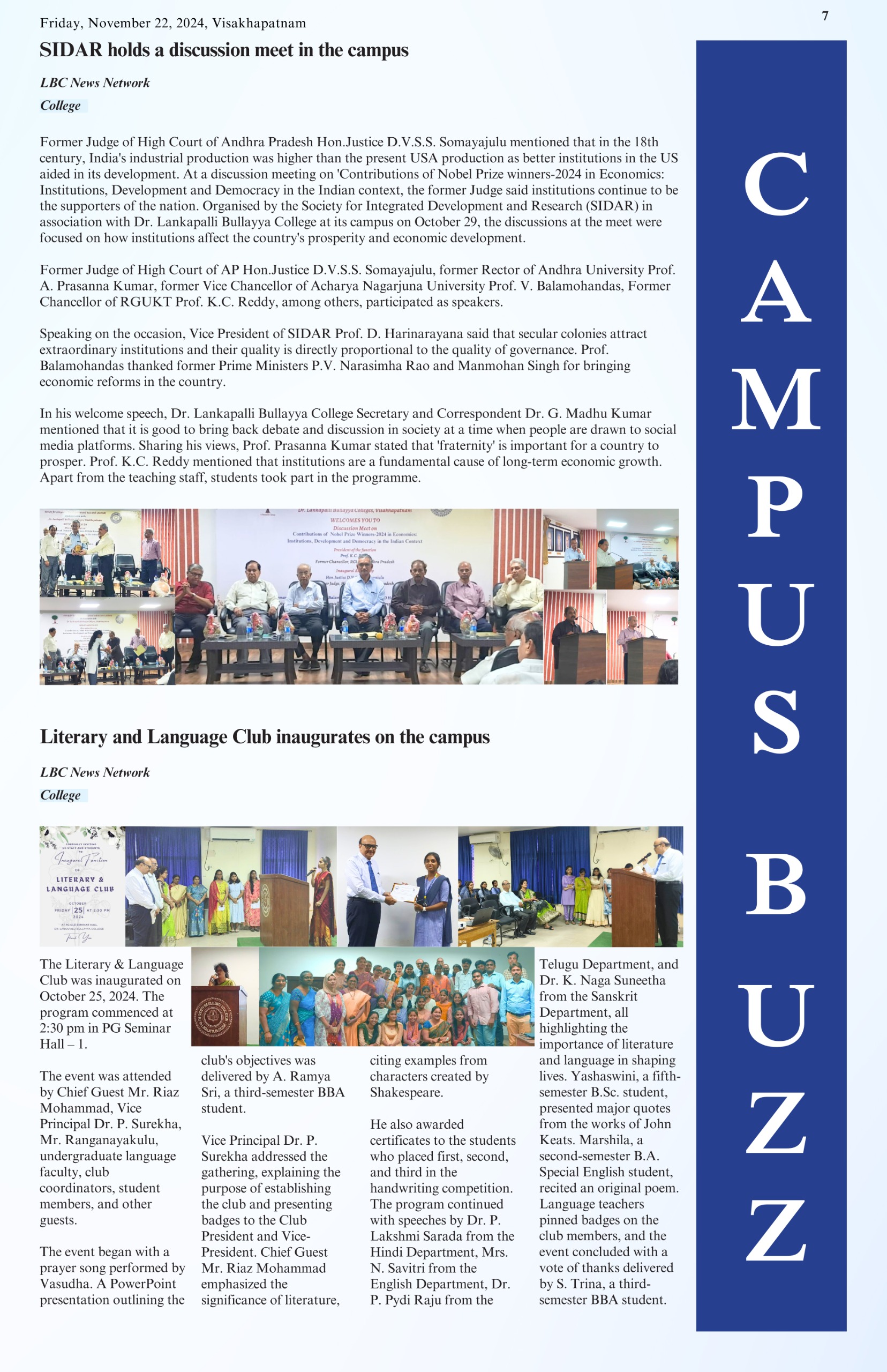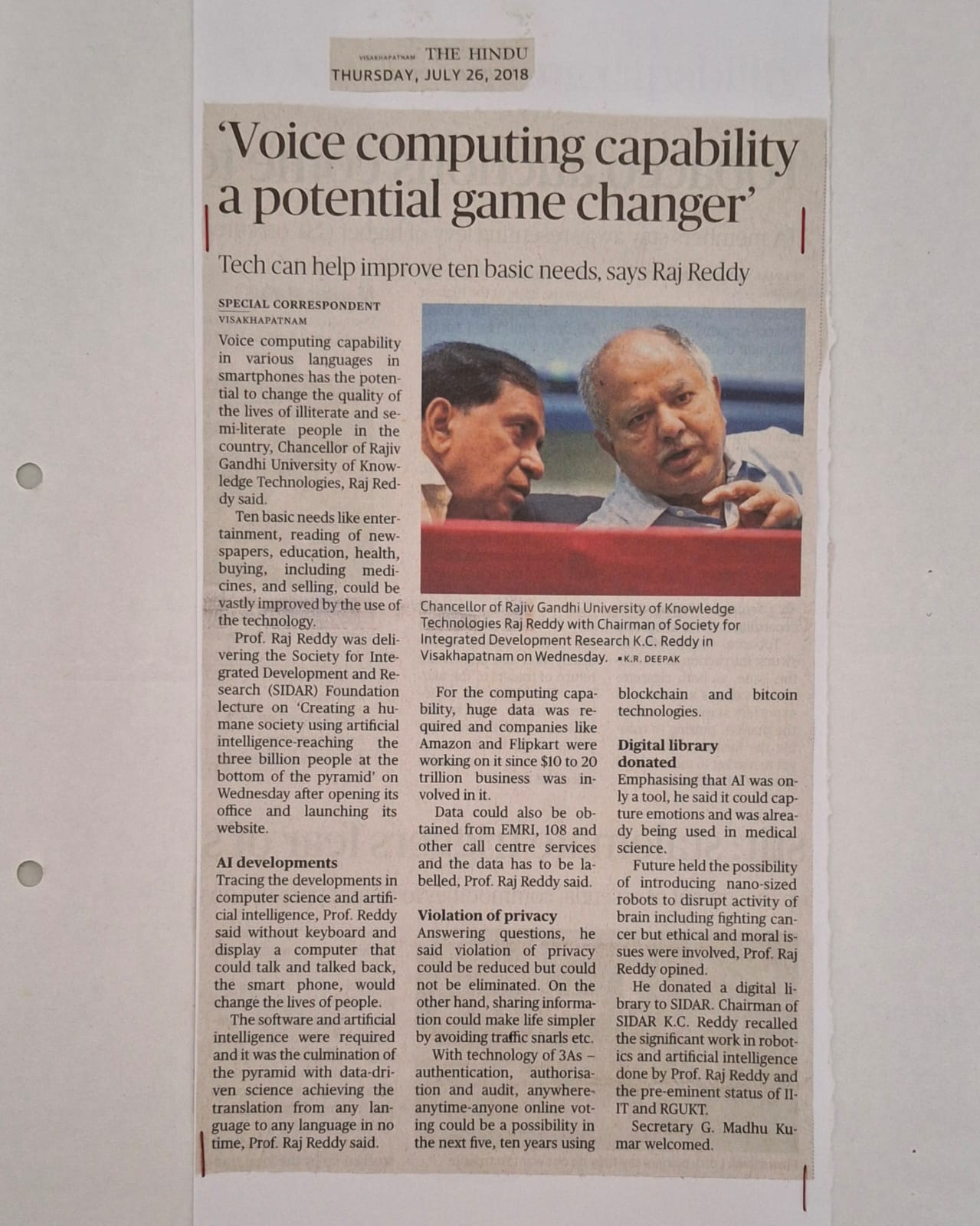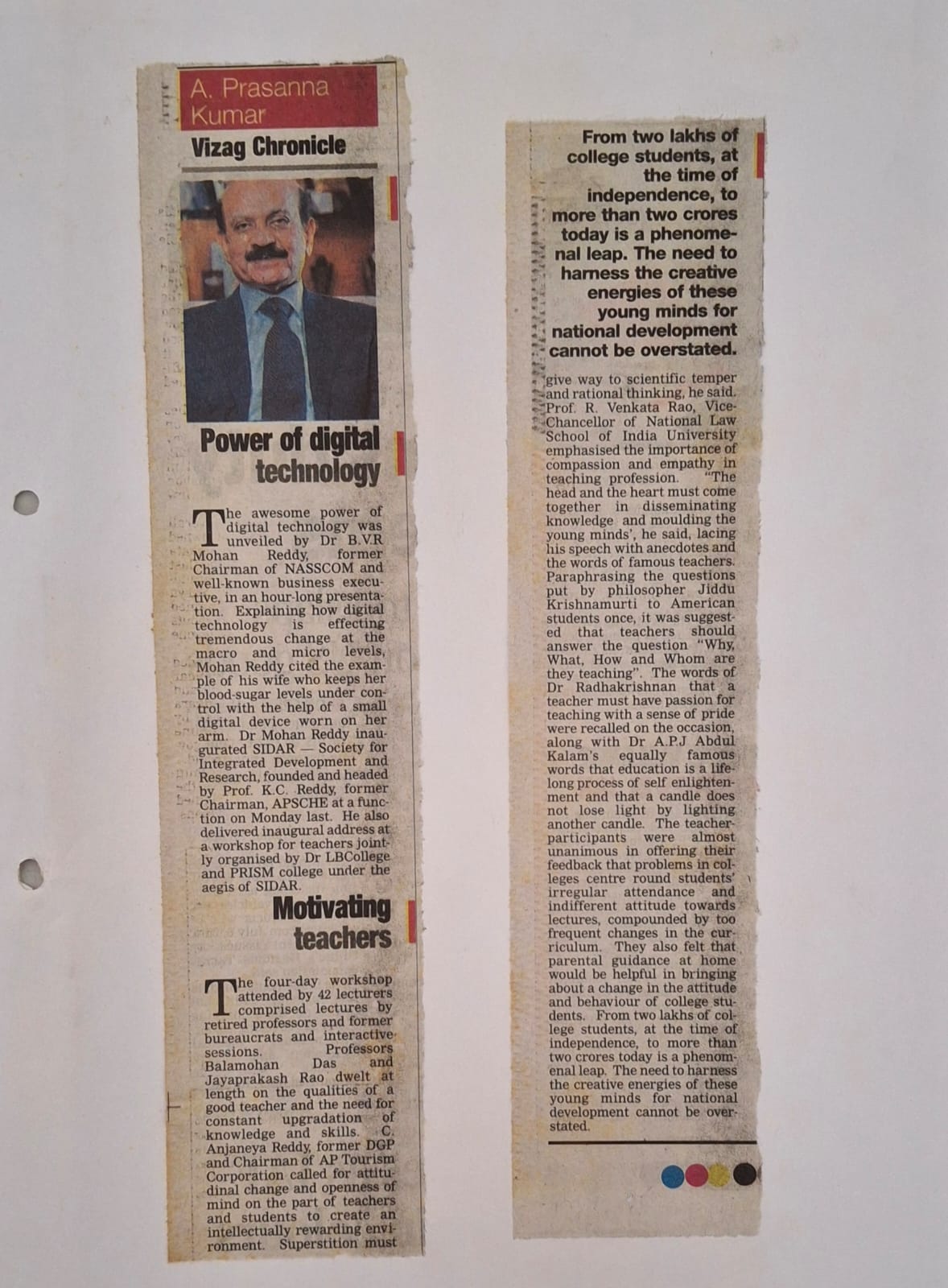 The DIGITAL LIBRARY of SIDAR - Dr. LBC Knowledge Resource Centre is inaugurated on 11th December 2018 at 12.00 noon by Professor Rokkam Radhakrishna, a distinguished Social Scientist, Chairman-CESS and Former Vice Chancellor, Andhra University. It was well attended by eminent scholars and faculty of Dr.L. Bullayya College. Prof. Radhakrishna spoke about the importance of digital library in the contemporary knowledge society, and pointed out the distinction between knowledge and wisdom. He also cautioned the necessary steps to develop content, categorization and its accessibility to students, faculty and citizens for better use of the facility.